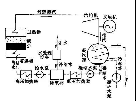 (1)给水系统。由锅炉产生的过热蒸汽沿主蒸汽管道进入汽轮机,高速流动的蒸汽冲动汽轮机叶片转动,带动发电机旋转产生电能。在汽轮机内作功后的蒸汽,其温度和压力大大降低,最后排入凝汽器并被冷却水冷却凝结成水(称为凝结水),汇集在凝汽器的热水井中。凝结水由凝结水泵打至低压加热器中加热,再经除氧器除氧并继续加热。由除氧器出来的水(叫锅炉给水),经给水泵升压和高压加热器加热,最后送人锅炉汽包。在现代大型机组中,一般都从汽轮机的某些中间级抽出作过功的部分蒸汽(称为抽汽),用以加热给水(叫做给水回热循环),或把作过一段功的蒸汽从汽轮机某一中间级全部抽出,送到锅炉的再热器中加热后再引入汽轮机的以后几级中继续做功(叫做再热循环)。